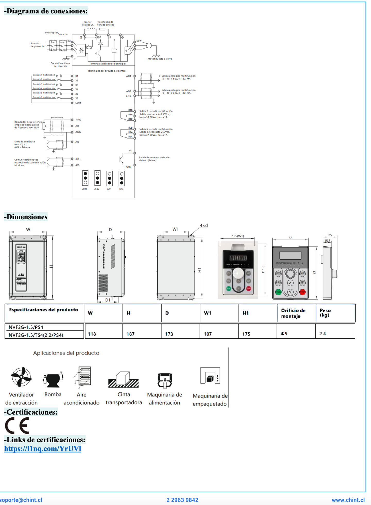 Variador de Frecuencia CHINT NVF2G-1.5/PS4 1,5 kW 3,7 A 3F 380 V con PID – Código 13082038CH