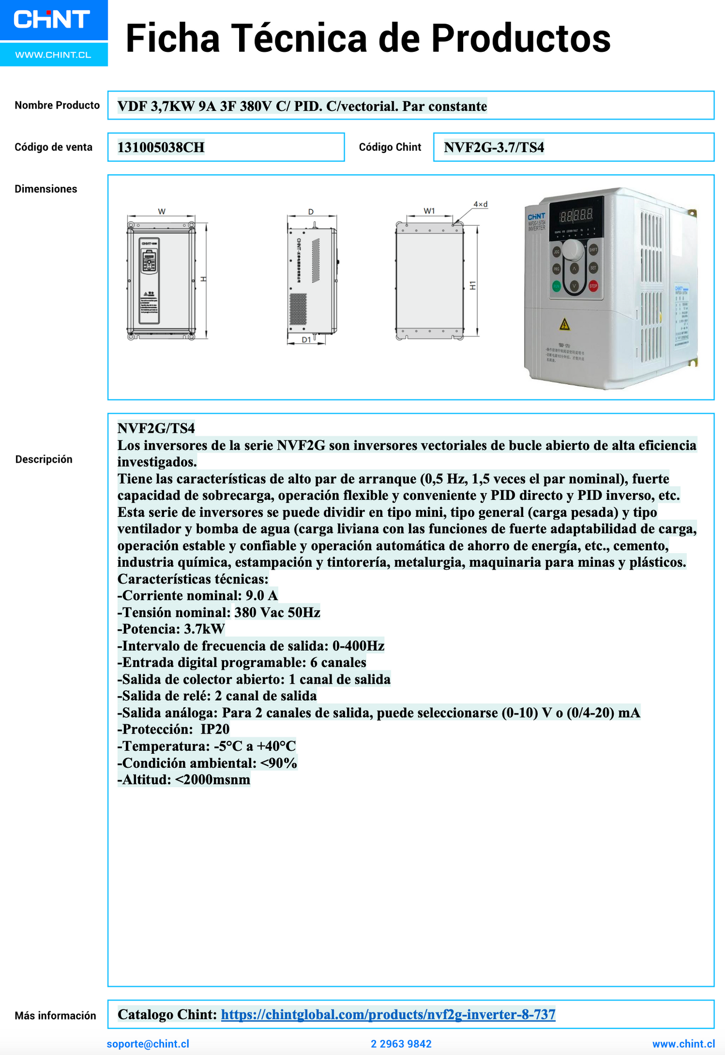 Variador de frecuencia CHINT NVF2G-3.7/TS4 trifásico de 3,7 kW y 9 A, tensión de entrada 380 V. Incorpora control vectorial y función PID, diseñado para aplicaciones de par constante en motores eléctricos industriales.