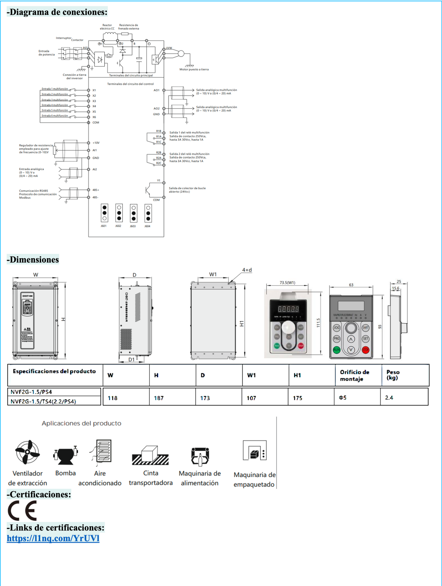 Variador de Frecuencia CHINT NVF2G-3.7/TS4 3,7 kW 9 A 3F 380 V con PID – Código 131005038CH